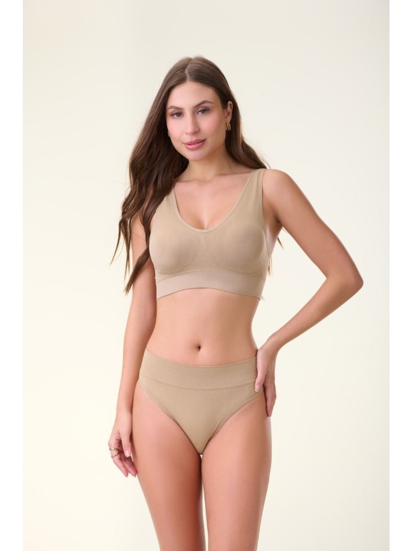 O top bege GG foi criado especialmente para quem busca mais cobertura e conforto. Sua modelagem contempla maior área de suporte nas costas, no busto e nas laterais, oferecendo sensação de segurança durante todo o dia. Ele não possui fechos, aros ou partes rígidas, garantindo experiência de uso totalmente livre de pressões ou desconfortos.