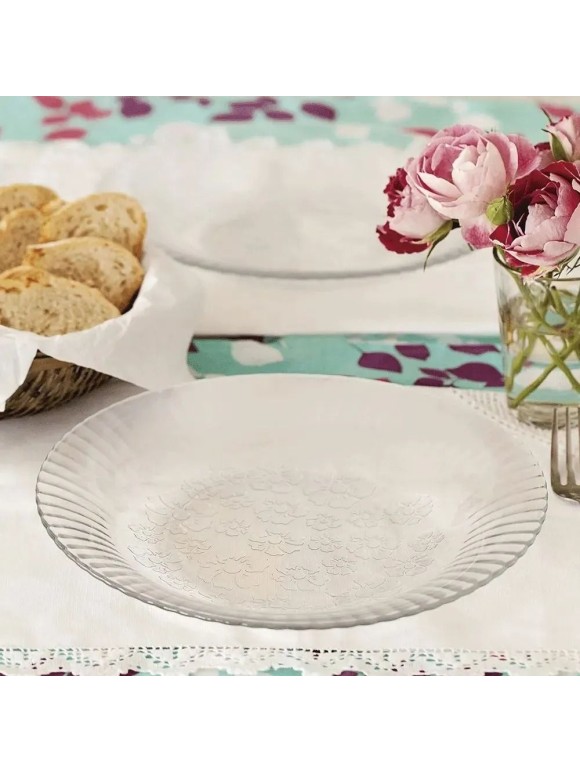 Este prato é perfeito para adicionar um toque de elegância à sua mesa. Com um diâmetro de 22 cm e altura de 3 cm, são ideais para servir sopas, caldos e outros pratos mais substanciais. Feitos de vidro transparente, possuem um lindo desenho florido que vai encantar seus convidados.