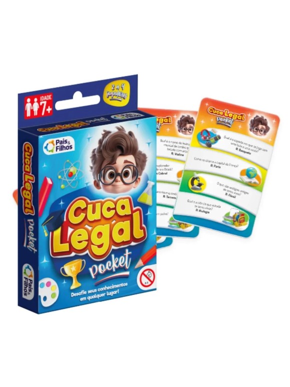 O Jogo Cuca Legal Pocket, da marca Pais & Filhos, é um divertido jogo de perguntas e respostas em versão compacta, ideal para crianças a partir de 7 anos. Seu formato “pocket” permite que ele seja facilmente levado na mochila ou mala, garantindo diversão a qualquer momento