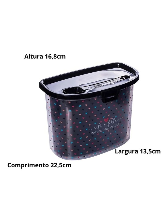 • Formato: recipiente com tampa de encaixe e compartimentos internos — um para o café e outro para o filtro. A colher medidora se encaixa com praticidade na tampa, otimizando espaço