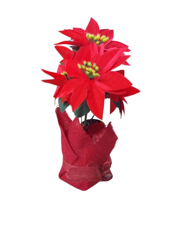 Vaso Juta Poinsettia Xmas – Decoração Natalina Rústica com Flor Vermelha e Detalhes Artesanais