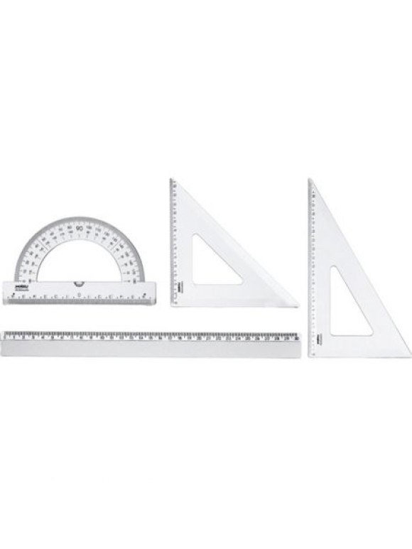 O Kit Geométrico Escolar com 4 Peças é composto por instrumentos essenciais: régua, esquadro de 45°, esquadro de 60° e transferidor.