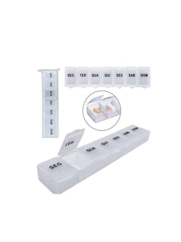Este Porta Comprimido Semanal foi projetado para trazer facilidade e eficiência no armazenamento e controle de medicações. Composto por 7 compartimentos individuais, cada um identificado com os dias da semana (SEG, TER, QUA, QUI, SEX, SAB e DOM), o organizador permite separar antecipadamente todas as doses necessárias para a semana inteira.